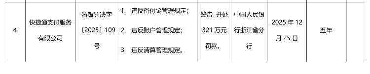 近日,中国人民银行浙江省分行发布行政处罚信息显示,快捷通支付服务有限公司因多项违法行为被处警告,罚款321万元,同时有两名相关责任人被罚。