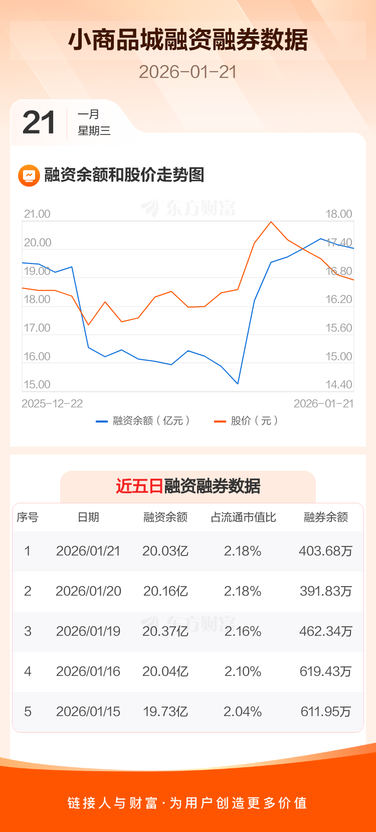 交易所最新数据显示,小商品城于2026年1月21日获融资买入1.17亿元,融资偿还1.30亿元,当日融资净偿还1357.18万元。目前,该股融资余额20.03亿,占流通市值比例为2.18%。