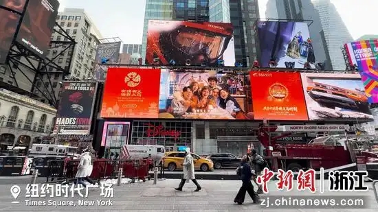 搞好大了!美国纽约时代广场的户外大屏滚动播放浙江义乌城市形象宣传片及央视2026