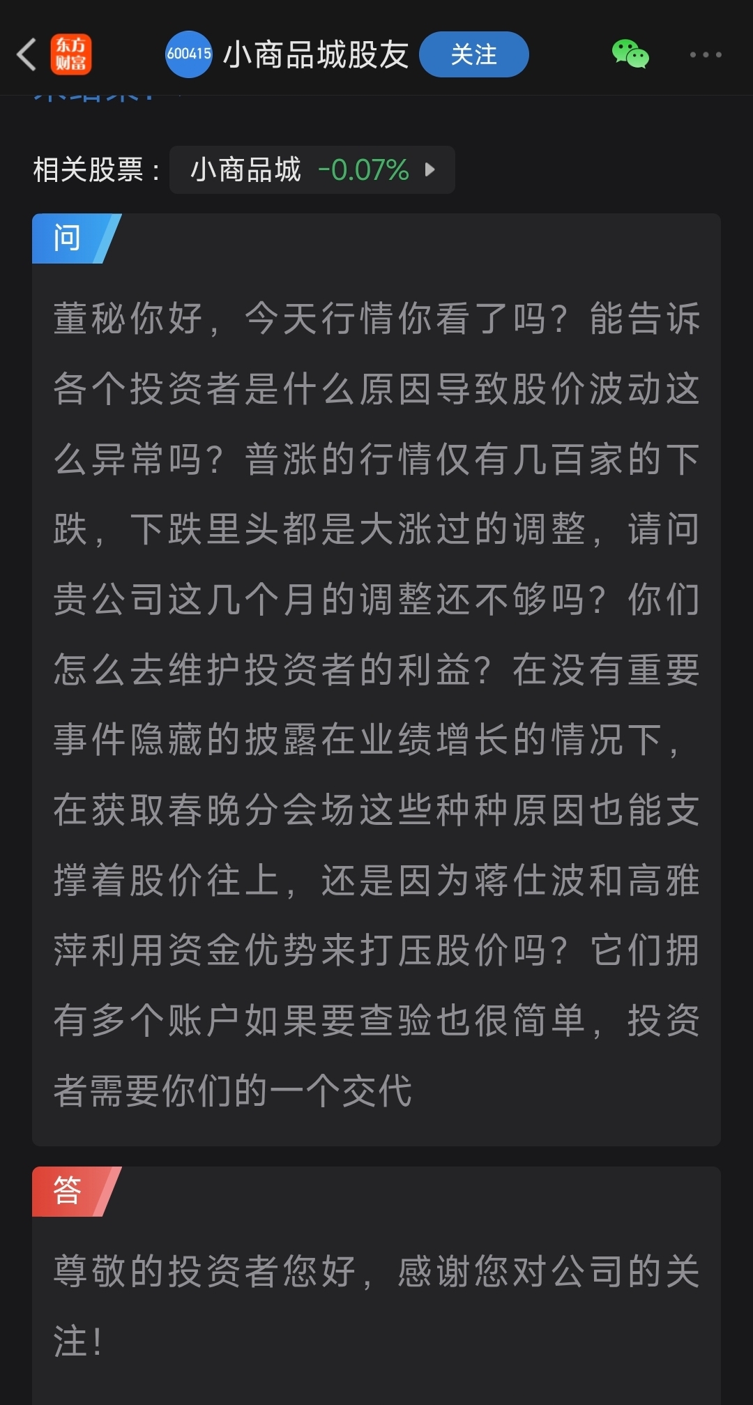 $小商品城(SH600415)$ 这是我见过的最敷衍,最不负责,最让人寒心的董秘!投资者200字的问题,董秘一句格式化的回答敷衍了!这还是人嘛。