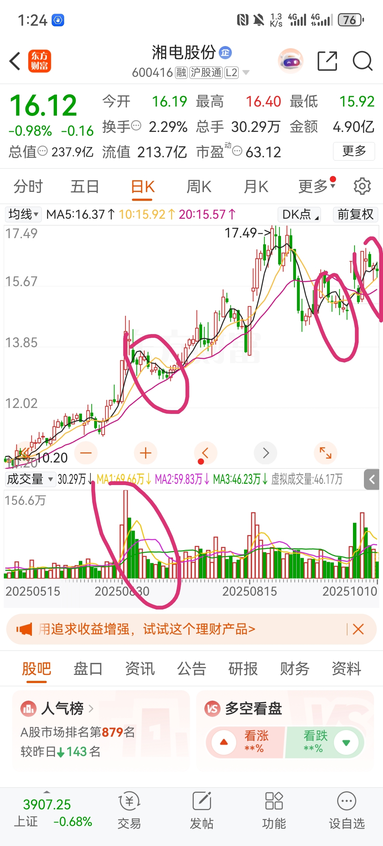 $湘电股份(SH600416)$ 股性,放量阳线后阴跌1-2周,现在重蹈复择。这次错过了几天的牛市,假期前的几天,还有昨天大好行情,今天回调,却也跟着回调,不带反弹。这股真实牛。