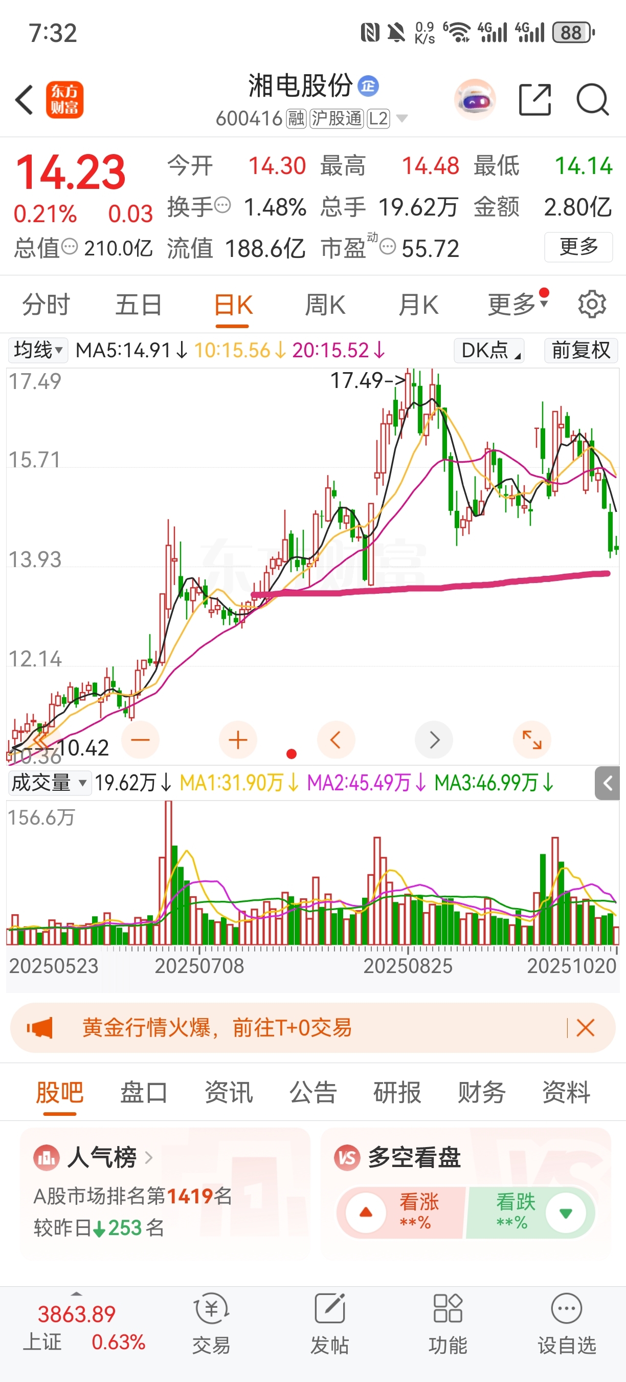 $湘电股份(SH600416)$ 明天的支撑位13.58左右,跌破就继续下行。1.2万散户,不得阴跌洗走咋行。