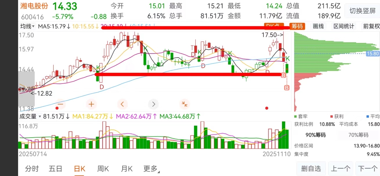 $湘电股份(SH600416)$ 非常喜欢湘电主力的洗盘风格,干脆利落,毫不犹豫。周五既然拉升有阻力,今天就索性立马洗到箱体底部,没有丝毫犹豫。这种操作手法,让不坚定的筹码尽快离场,这种操作看似不讲感情,但其实是非常有水平,不会过多耽误看好这个票并且坚定持仓的朋友们的时间,目前留下来的基本都是非常看好的。预测接下来走震荡修复,进一步洗掉不坚定的筹码。