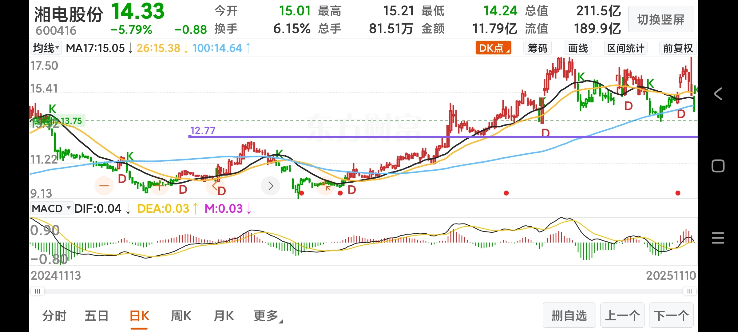 $湘电股份(SH600416)$ 这个点不能破!12.88附近!多空转换点