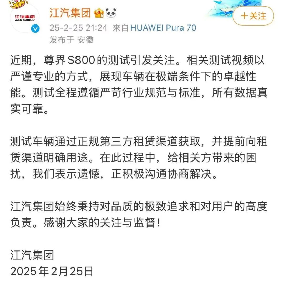 江汽集团称,近期,尊界S800的测试引发关注。相关测试视频以严谨专业的方式,展现车辆在极端条件下的卓越性能。测试全程遵循严苛行业规范与标准,所有数据真实可靠。测试车辆通过正规第三方租赁渠道获取,并提前向租赁渠道明确用途。在此过程中,给相关方带来的困扰,江汽集团表示遗憾,正积极沟通协商解决。