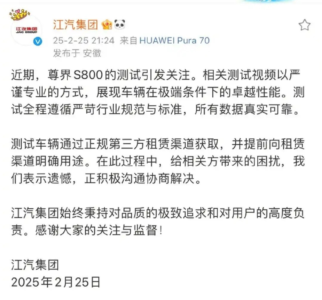 江汽集团官方微博声明全文如下: