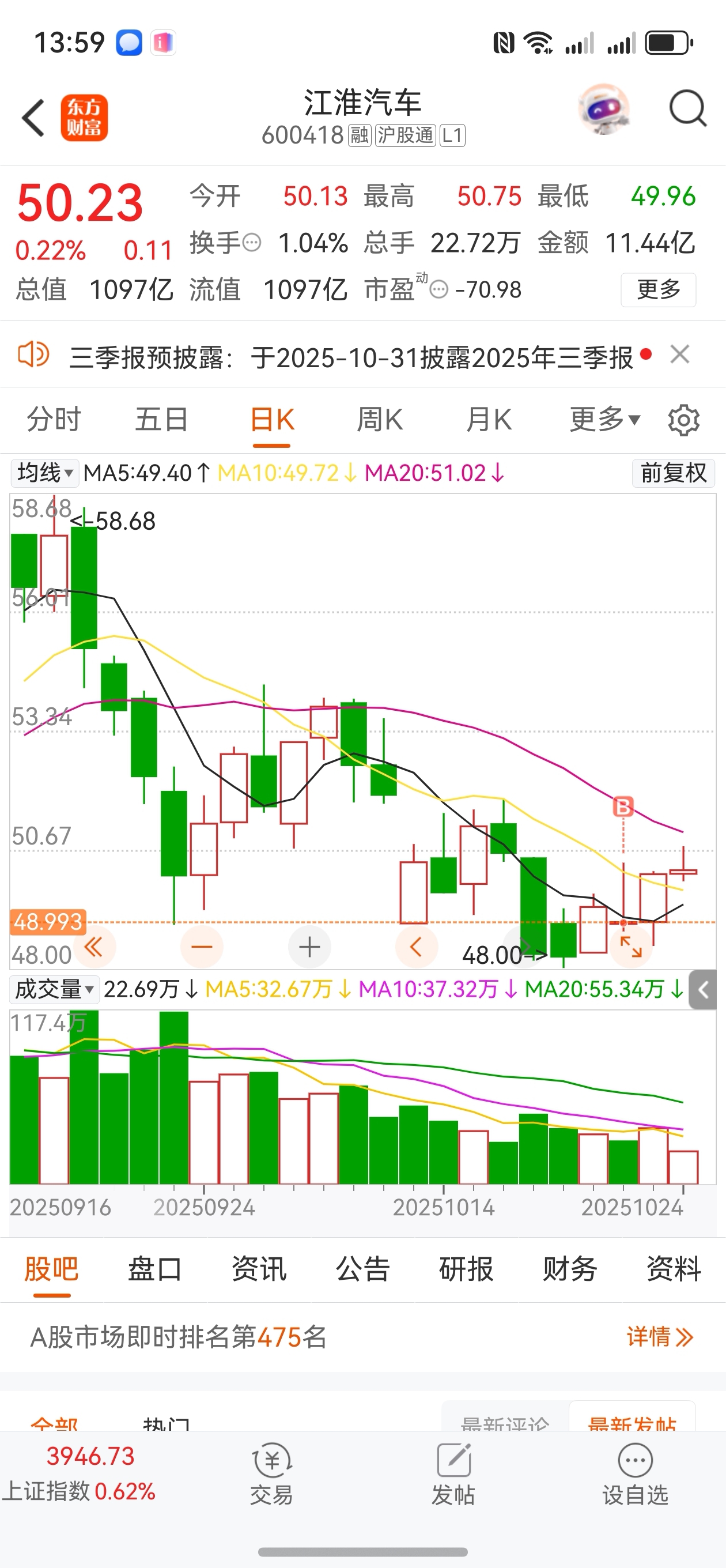 $江淮汽车(SH600418)$ 前天48.99元接回来了,到59.88出