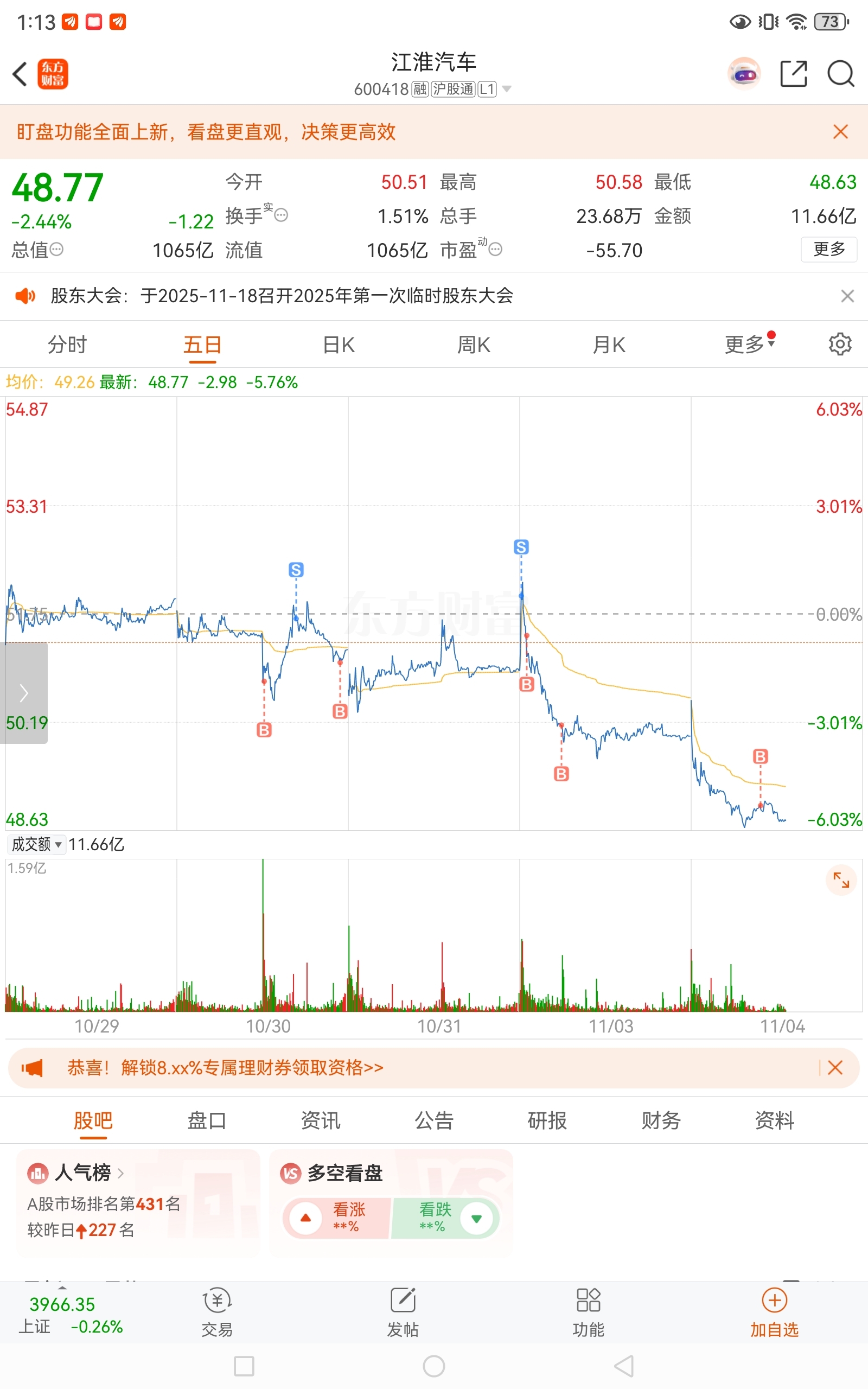 $江淮汽车(SH600418)$ 亏了就加涨了就卖,就是不走