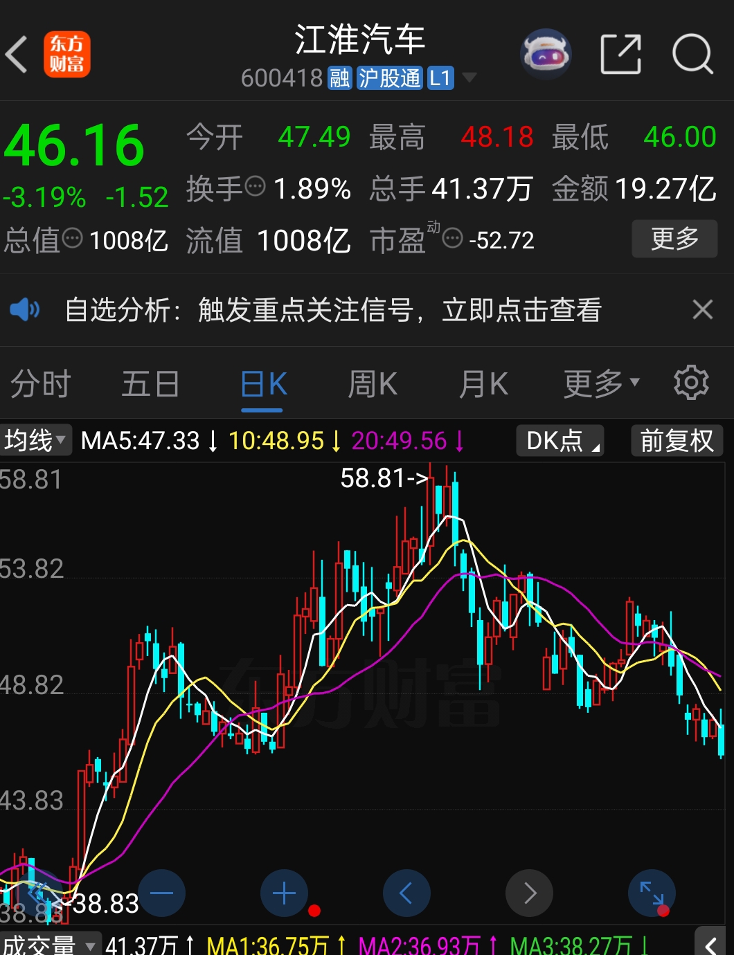 $江淮汽车(SH600418)$ 明天继续大跌3%以上,唱多的被套可以继续怼我的,你的认知比较高,可以上80,可以看出3年后的股价,怎么看不出阴跌不止?日线周线破位,散户增多筹码分散,定增不明,销量产量玩暗语,老乡别走