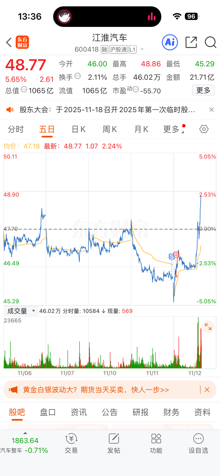 $江淮汽车(SH600418)$ 昨天卖了一半 还好今天接回来了 差点拍断大腿