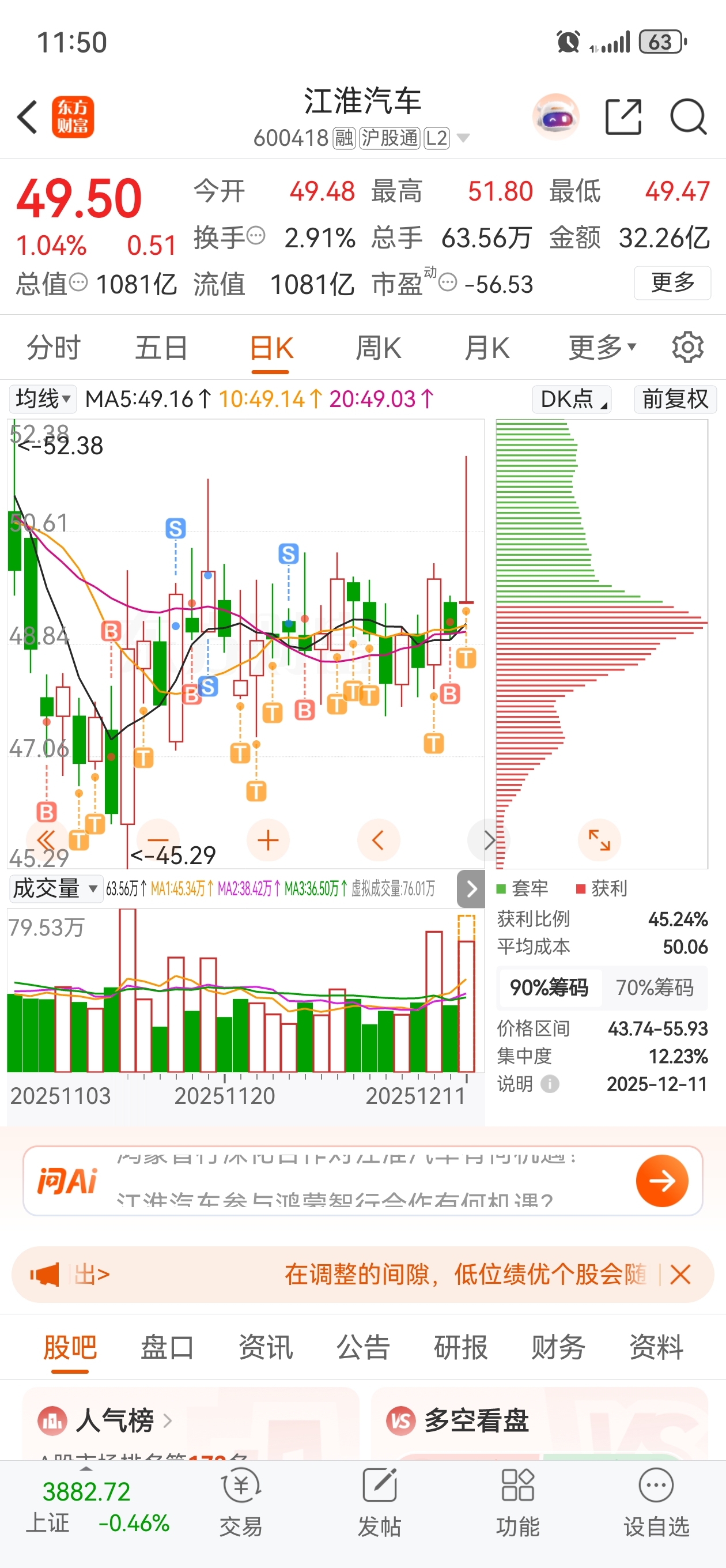 $江淮汽车(SH600418)$ 每天T个五毛钱就行