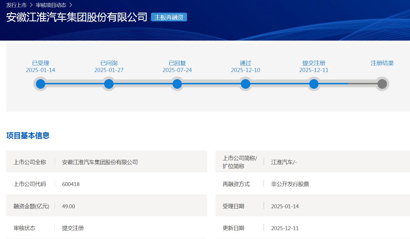 上交所网站显示,安徽江淮汽车集团股份有限公司(600418以下简称“江淮汽车”)于12月11日更新募集说明书(注册稿)及相关申请文件。据悉,江淮汽车此次定增募资金额已调整为不超过35亿元,拟投向高端智能电动平台开发项目。