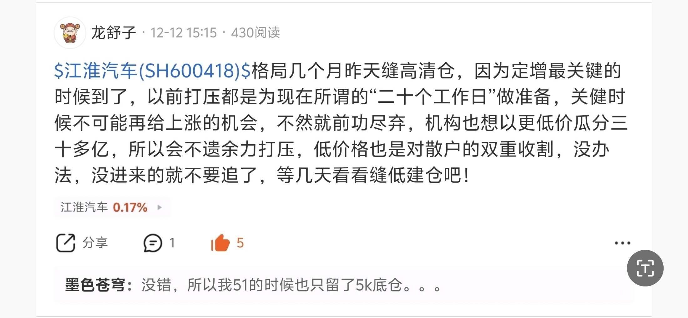 $江淮汽车(SH600418)$ 这种情况我早看明白了,所以我在11号高点清了,等了两天再进的,然后高卖低买还是挣的,也算是割主力韭菜