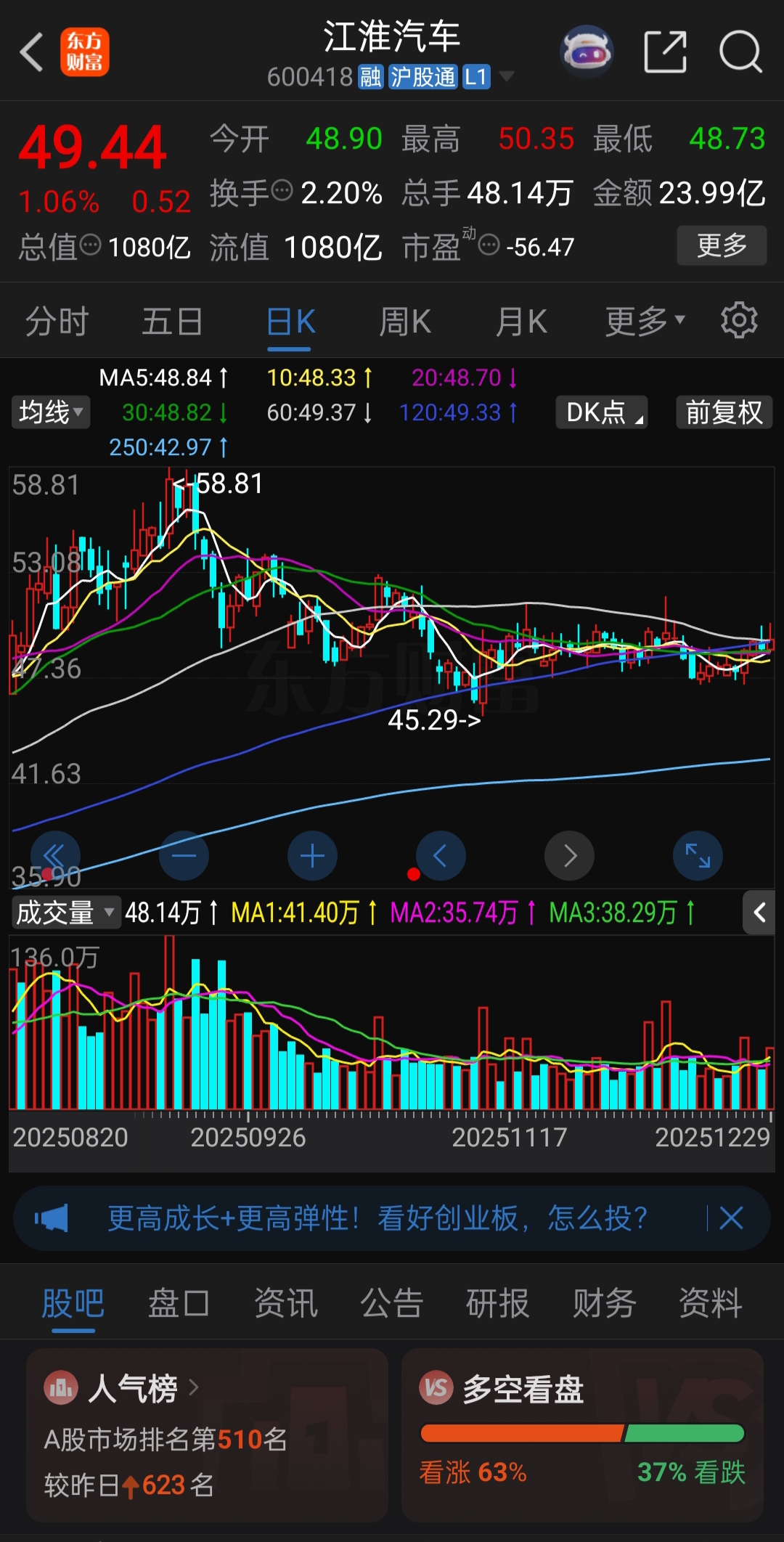 $江淮汽车(SH600418)$ 绝非危言耸听,接下来两天会有个中大阴线提振士气,很明显大盘和个股今天完成了诱多动作,高标股也退潮了,很多小可爱被套雪山之巅,元旦之前都会磨磨这波韭菜,看看这里面的元旦大红包就知道多难受了,45或者很低虽迟但到,未来见证。不喜快喷,不喜快喷,不喜快喷。