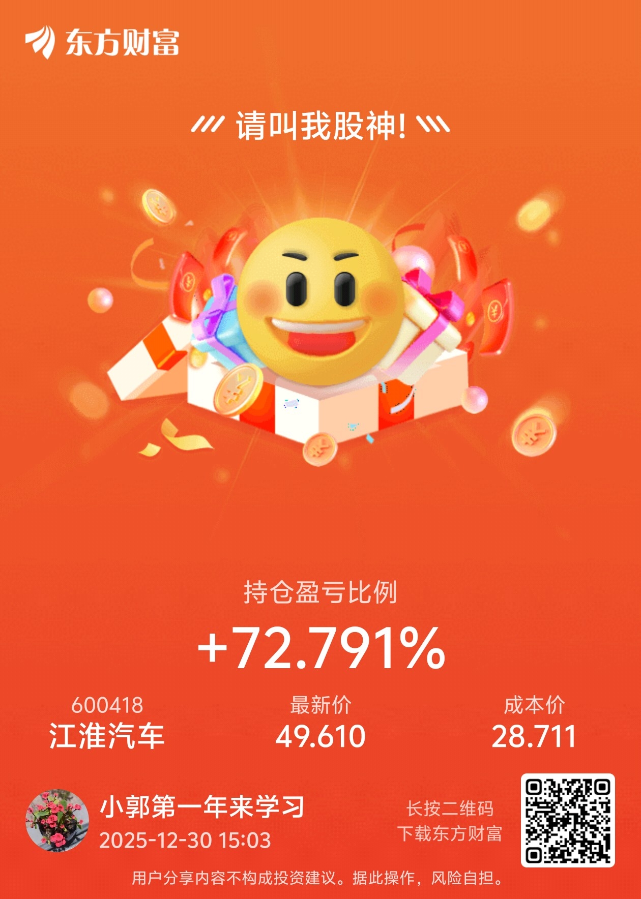 $江淮汽车(SH600418)$ 留个底仓明年接着玩。提前祝江淮的股东们元旦快乐