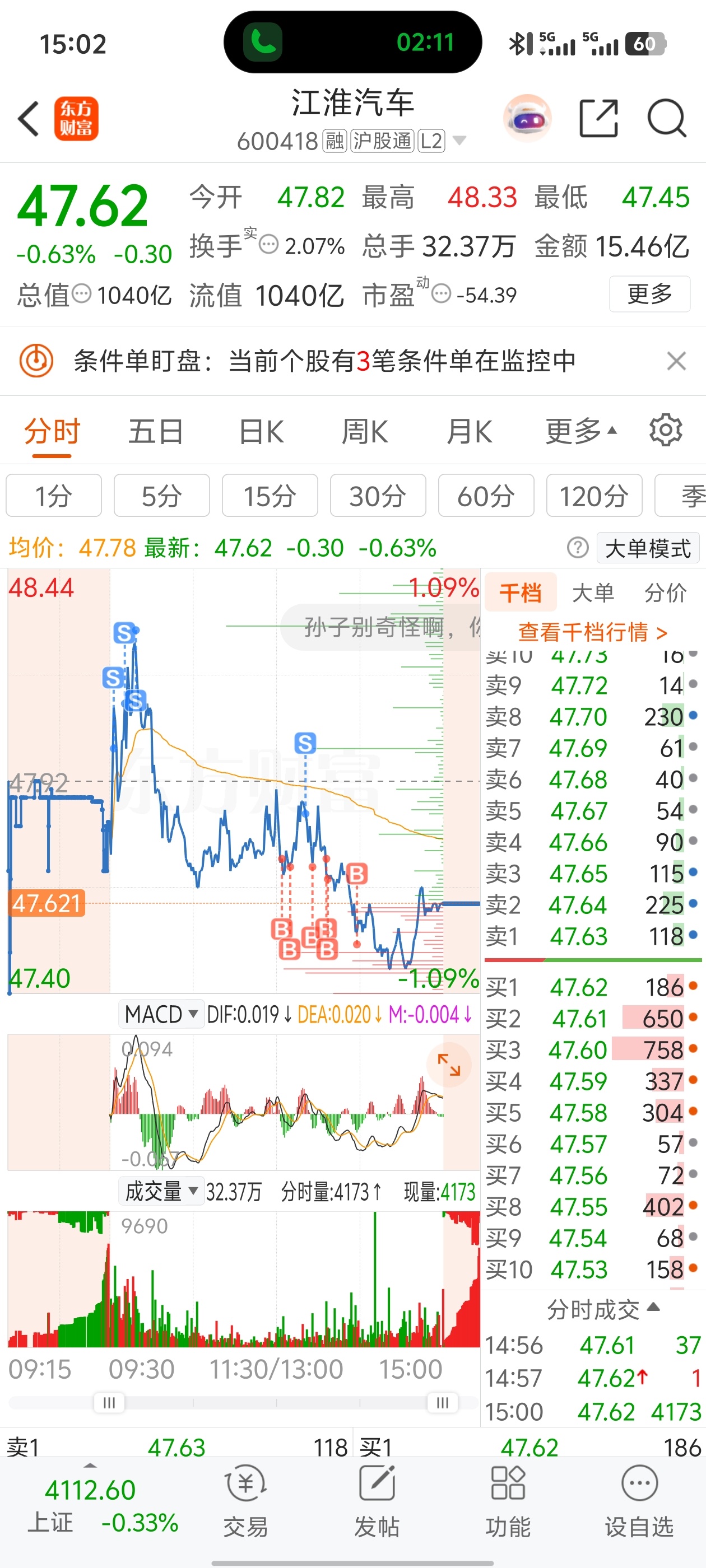 $江淮汽车(SH600418)$ 不知道明天能不能跌破47