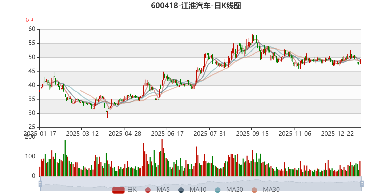 据公告,公司业绩变动原因为,受国际形势日趋复杂、境外汽车市场竞争日益加剧影响,公司出口业务有所下滑。2025年公司联营企业大众安徽经营业绩出现亏损,导致报告期内公司确认对大众安徽的投资收益为-10.8亿元左右。