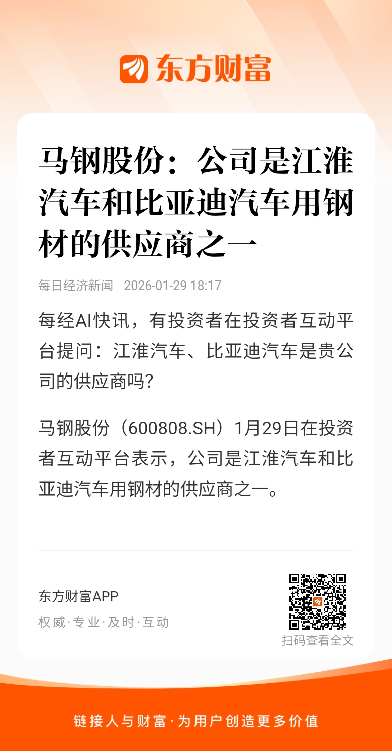 马钢股份(600808.SH)1月29日在投资者互动平台表示,公司是江淮汽车和比亚迪汽车用钢材的供应商之一。