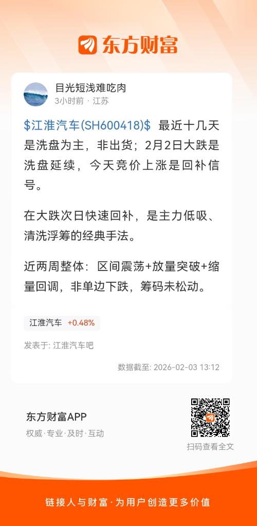 $江淮汽车(SH600418)$ 最近十几天是洗盘为主,非出货;2月2日大跌是洗盘延续,今天竞价上涨是回补信号。