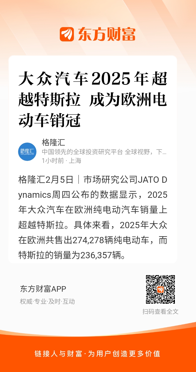 格隆汇2月5日|市场研究公司JATO Dynamics周四公布的数据显示,2025年大众汽车在欧洲纯电动汽车销量上超越特斯拉。具体来看,2025年大众在欧洲共售出274,278辆纯电动车,而特斯拉的销量为236,357辆。