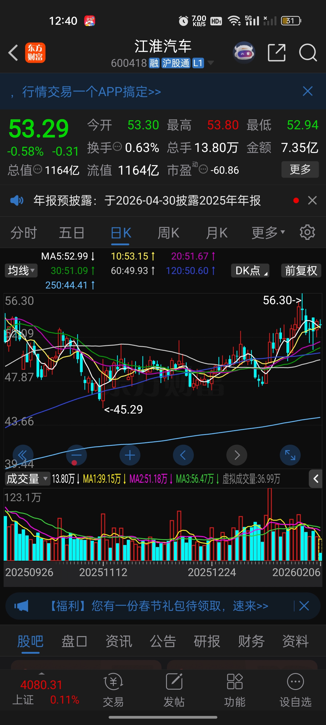 $江淮汽车(SH600418)$ 下周就能到45了,耐心点,这次接盘的人很多,空仓等待好时机,让在山顶的韭菜瑟瑟发抖,哈哈