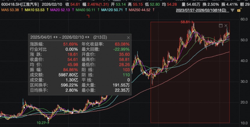 从股价情况来看,自2025年4月份以来,江淮汽车累计大涨超50%。