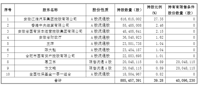 发行完成后,葛卫东、方文艳将并列为江淮汽车第8大股东。