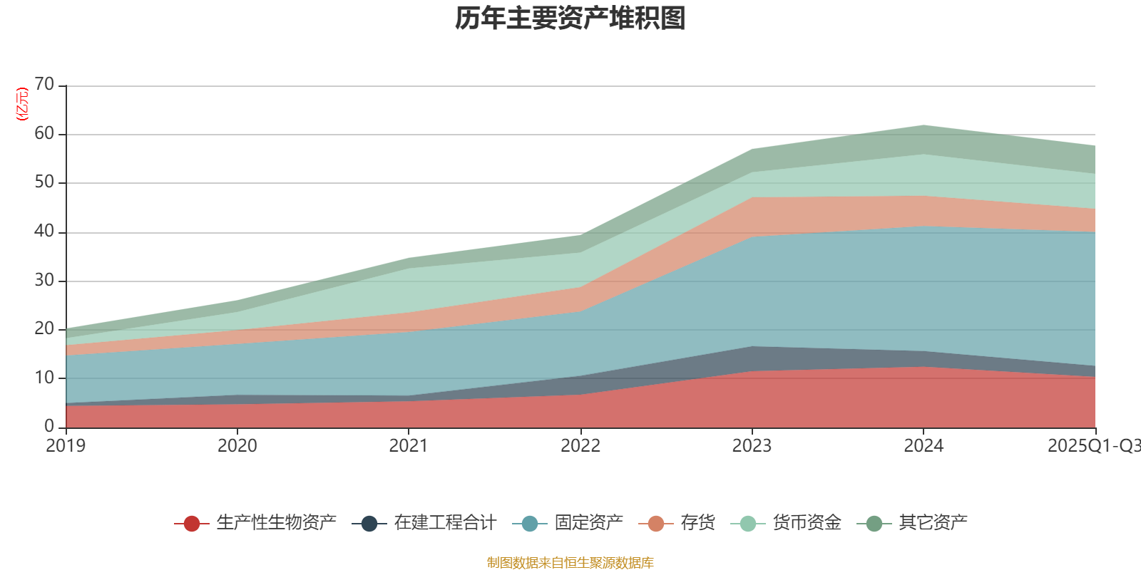 资产重大变化方面,截至2025年三季度末,公司固定资产较上年末增加7.13%,占公司总资产比重上升6.21个百分点;生产性生物资产较上年末减少16.72%,占公司总资产比重下降2.13个百分点;存货较上年末减少23.59%,占公司总资产比重下降1.8个百分点;货币资金较上年末减少15.59%,占公司总资产比重下降1.28个百分点。