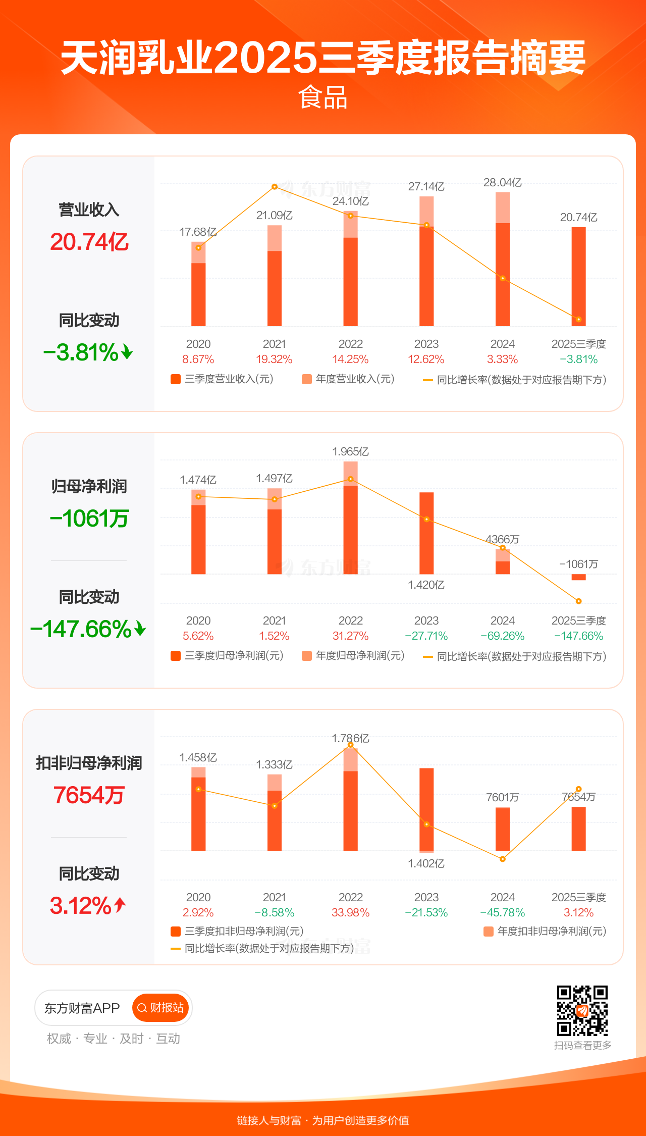 天润乳业10月24日发布2025年三季报显示,公司前三季实现营业收入20.74亿元,同比下滑3.81%;归母净利润-1061.45万元;扣非归母净利润7654.01万元,同比增长3.12%