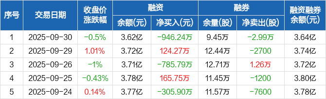 昆药集团:融资净偿还946.24万元,融资余额3.62亿元(09-30)