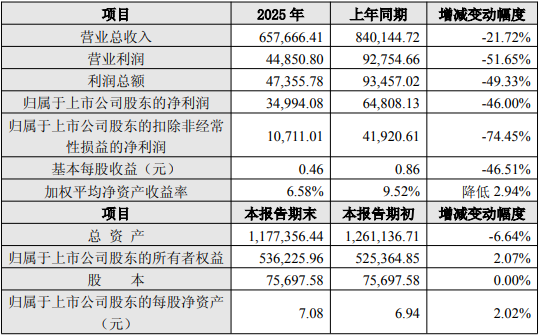 2月6日,昆药集团(600422)发布的2025年度业绩快报显示,公司报告期内实现营业总收入65.77亿元,同比下降21.72%;归属于上市公司股东的净利润3.5亿元,同比下降46%;基本每股收益0.46元。