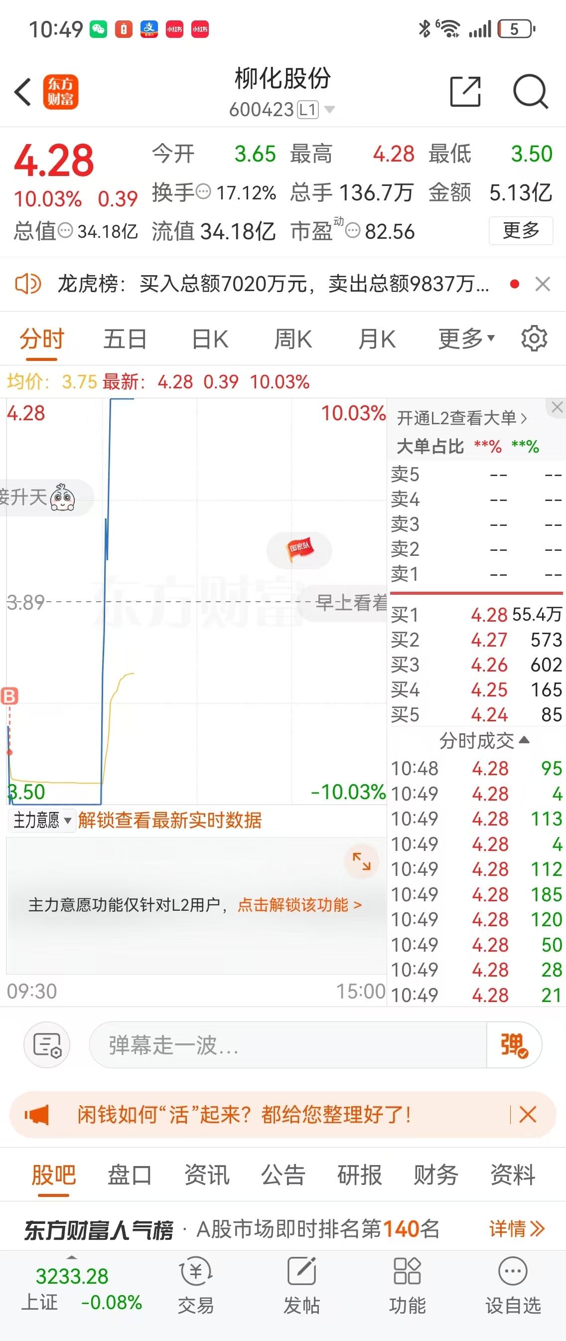 $柳化股份(SH600423)$ 16号把手里的全,均价4块04 全出了 ,今天鬼使神差在跌停附近又买了 ,想到给了地天 ,柳化牛逼
