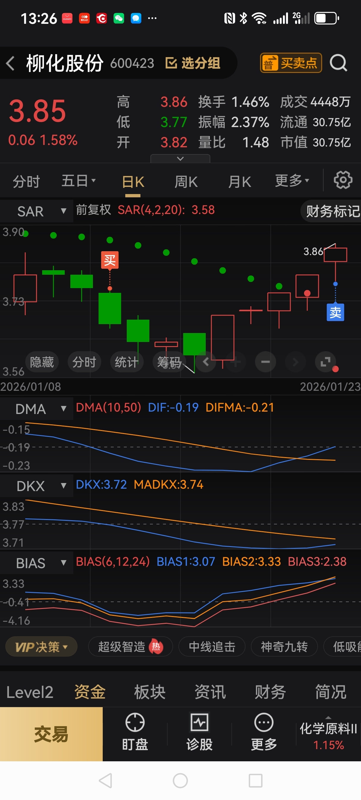 柳化股份,零钱3.73建仓一手,1月23号,已清仓3.85一手,微利1.81元。