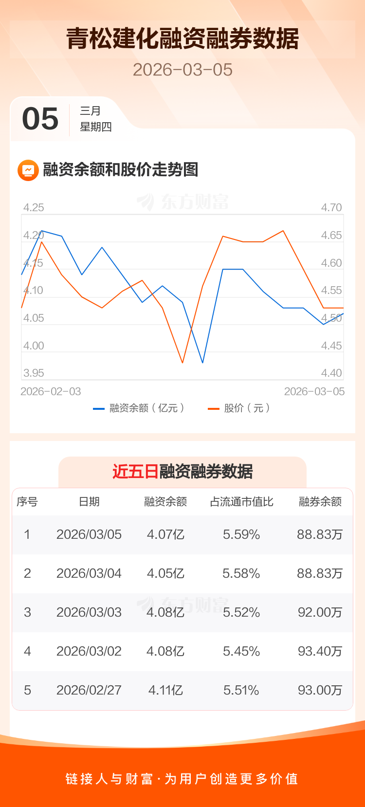 交易所最新数据显示,青松建化于2026年3月5日获融资买入2628.83万元,融资偿还2522.06万元,当日融资净买入106.77万元。目前,该股融资余额4.07亿,占流通市值比例为5.59%。
