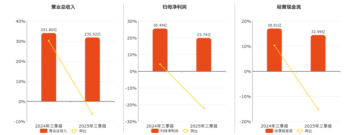 公司营业总收入为235.52亿元,在已披露的同业公司中排名第3,较去年同报告期营业总收入减少16.28亿元,同比较去年同期下降6.46%。归母净利润为23.74亿元,在已披露的同业公司中排名第3,较去年同报告期归母净利润减少6.75亿元,同比较去年同期下降22.14%。经营活动现金净流入为32.99亿元,在已披露的同业公司中排名第3,较去年同报告期经营活动现金净流入减少5.93亿元,同比较去年同期下降15.23%。