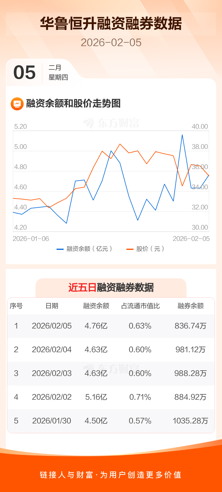 交易所最新数据显示,华鲁恒升于2026年2月5日获融资买入4078.60万元,融资偿还2755.99万元,当日融资净买入1322.61万元。目前,该股融资余额4.76亿,占流通市值比例为0.63%。