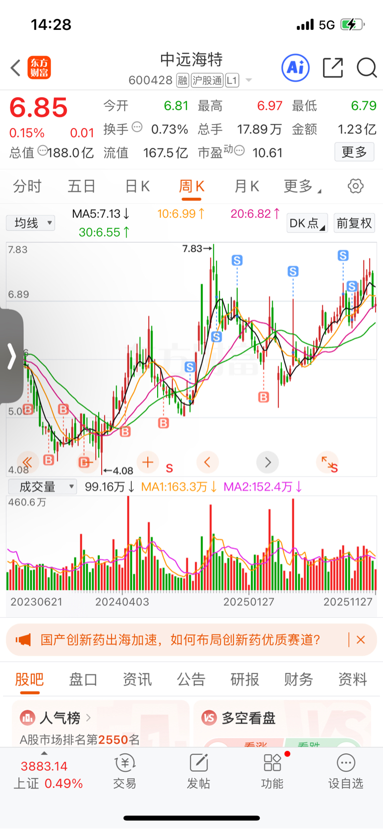 $中远海特(SH600428)$ 我的靠山哟、差点给你小子忘记了,还是那句话,拿着你被你折麽才能走向更高的山、