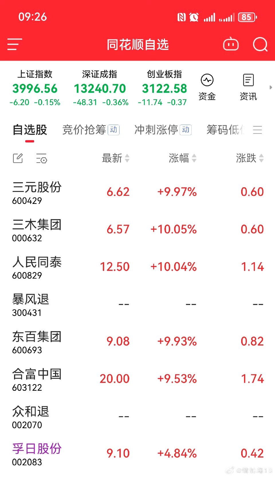 $三元股份(SH600429)$ 11月12日9点28分:分仓买靠前排的,低吸+打回封。1.单点2天三元股份,三木集团,人民同泰,东百集团盯板吃肉。2.单点6天全仓总龙头合富中国吃肉。3.单点4天的孚日股份(摩恩电气)止盈。收工。