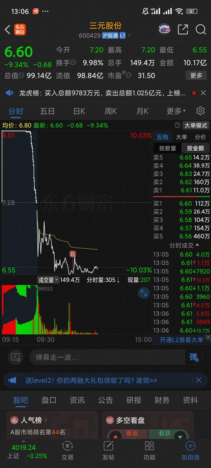 $三元股份(SH600429)$ 看错了,虽然就一手
