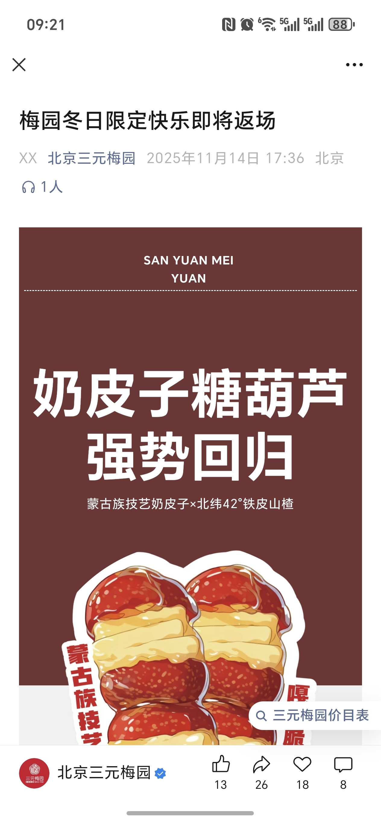 2025年11月14日,北京三元梅园微信服务号“奶皮子糖葫芦,强势回归”,希望周