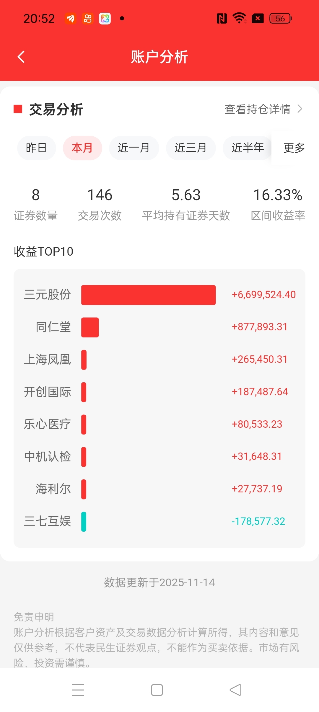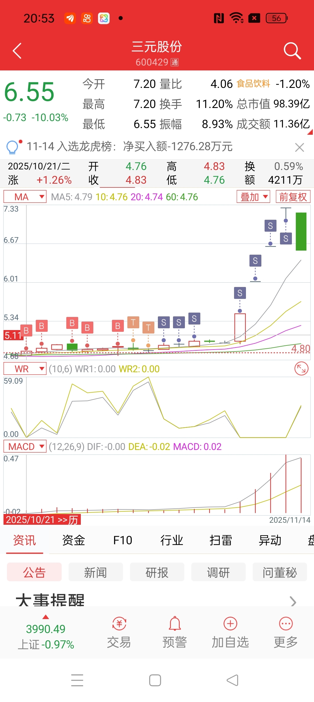 $三元股份(SH600429)$ #周末杂谈# 在三元三季推发佈前几天,根据去年下半年财务报表,预测其三季报会比去年有大幅提升,再加上今年涨幅落后于大盘,三季报发佈后,会成为其股价快速上涨的起动器,于是在10月21日起五个交易日内快速建仓,随着后来的几天连续涨停,毎天有计划减仓,第四个板全部清仓!贪婪是炒股之大忌!只要坚定执行自己的交易计划,什么量化交易呀都不是不可战胜的!