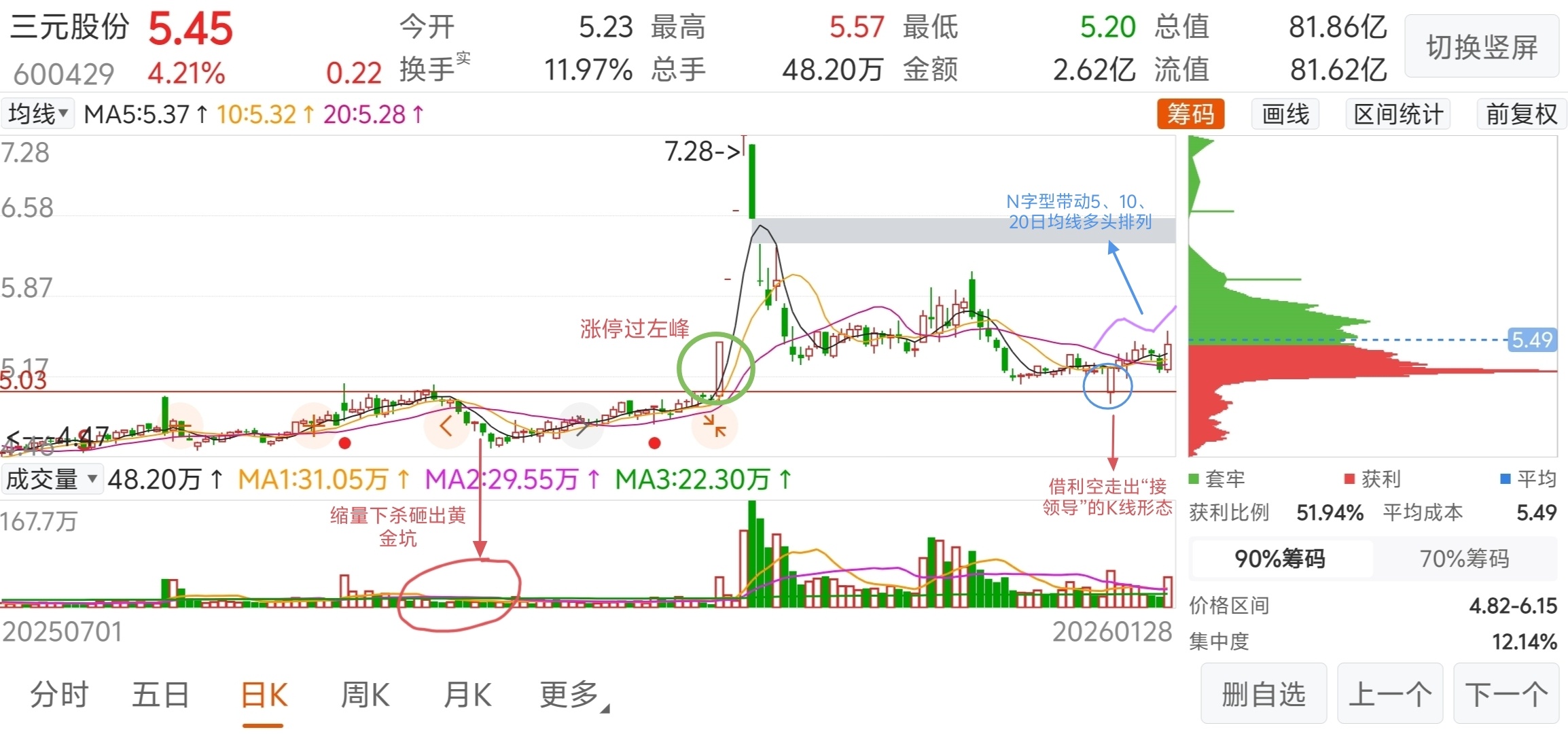 今天又有老粉想问我买它的逻辑,基本上就是图中这个样子,在连续涨停那一波之前这股已经盘了很久了,突然来了一波缩量下跌然后继续盘整,直到有一天走出一个涨停过左峰的形态,量化在这里干活了,量化成本大概就在我画红线那里,这种量化吃独食的形态散户是及难发觉的,后面直接一字封板,目前这个位置又回到前一波启动的原点了。19号那一天借业绩暴雷做了一个倒车接领导的K线,后面连续小碎步后又回踩两天,今天正是再次放量启动,带动均线开始有多头排列的迹象,走出一个底部N字型的形态,后期看反弹。逻辑就是这么一个逻辑,就看接下来它的表演了。@拿住不要被洗走