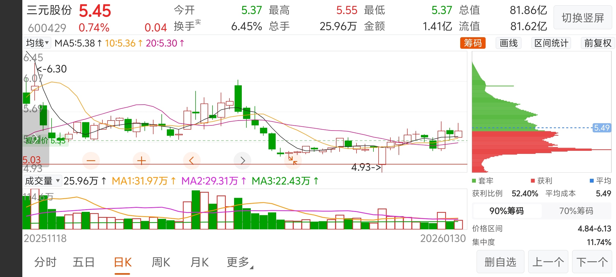 潦草收场,本来今天想喷一下子,结果市场情绪不给力,还是没能走出多方炮的形态,但还好,在前天的实体阳线的上半部位撑住了,如果周一能继续在这里盘而不跌,大概率后面一到两个交易日就要向上喷了,跟我之前让关注的云煤能源的逻辑差不多,现在就等它发射就好。但不能跌破前天阳线的开盘价,如果一旦大阴线跌破收不回来,那它短期就很危险了,未来一到两个交易日重点关注它,一旦选了方向就是我止盈或止损的选择,目标位6元不变,继续持股待涨