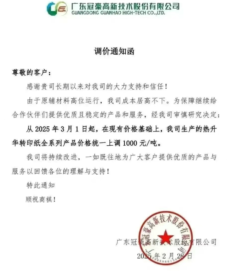 冠豪高新在调价通知函中介绍,由于原辅材料高位运行,导致公司成本居高不下。为保障继续给合作伙伴们提供优质且稳定的产品和服务,公司审慎研究决定,从2025年3月1日起,在现有价格基础上,公司生产的热升华转印纸全系列产品价格统一上调1000元/吨。