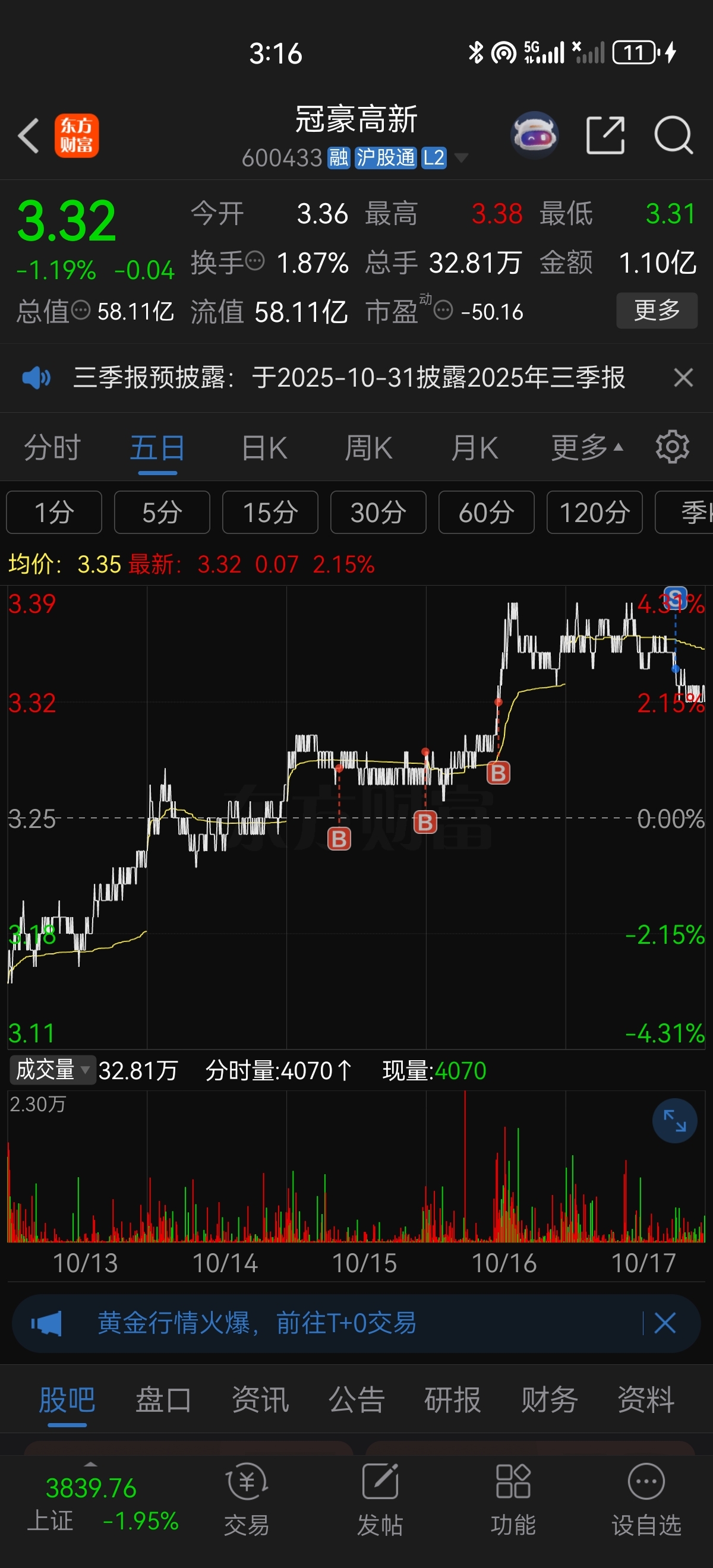 $冠豪高新(SH600433)$ 买你以为换手低会有肉吃,哎喝点汤走了
