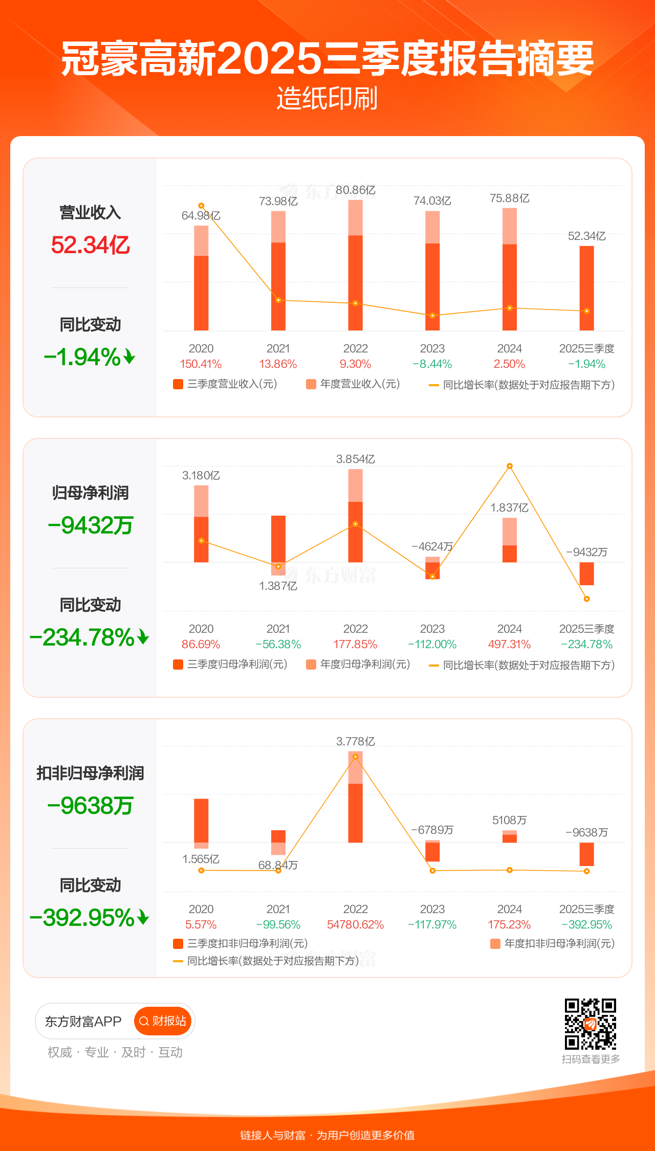 冠豪高新10月31日发布2025年三季报显示,公司前三季实现营业收入52.34亿元,同比下滑1.94%;归母净利润-9432.39万元;扣非归母净利润-9638.38万元。