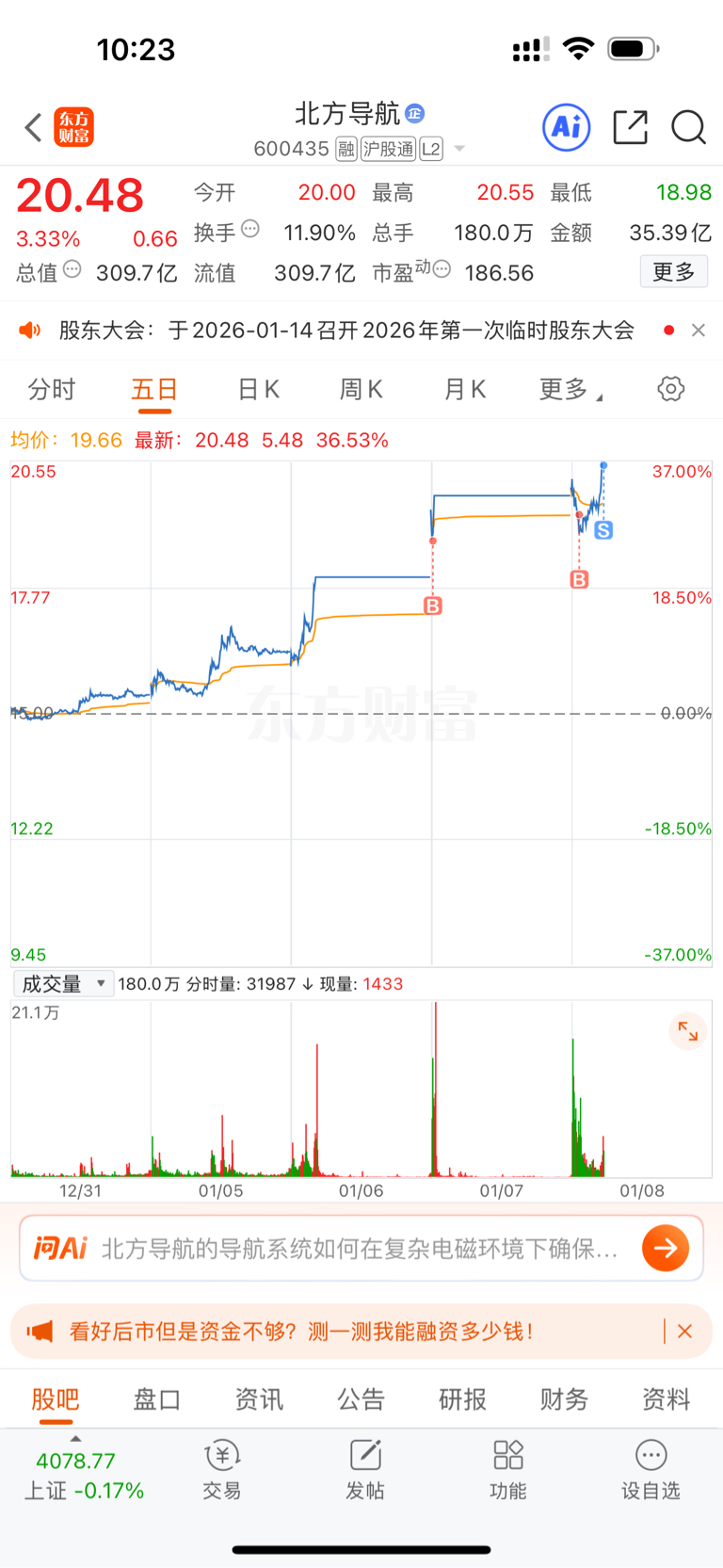 $北方导航(SH600435)$ 下班,少T2个点,没那么完美