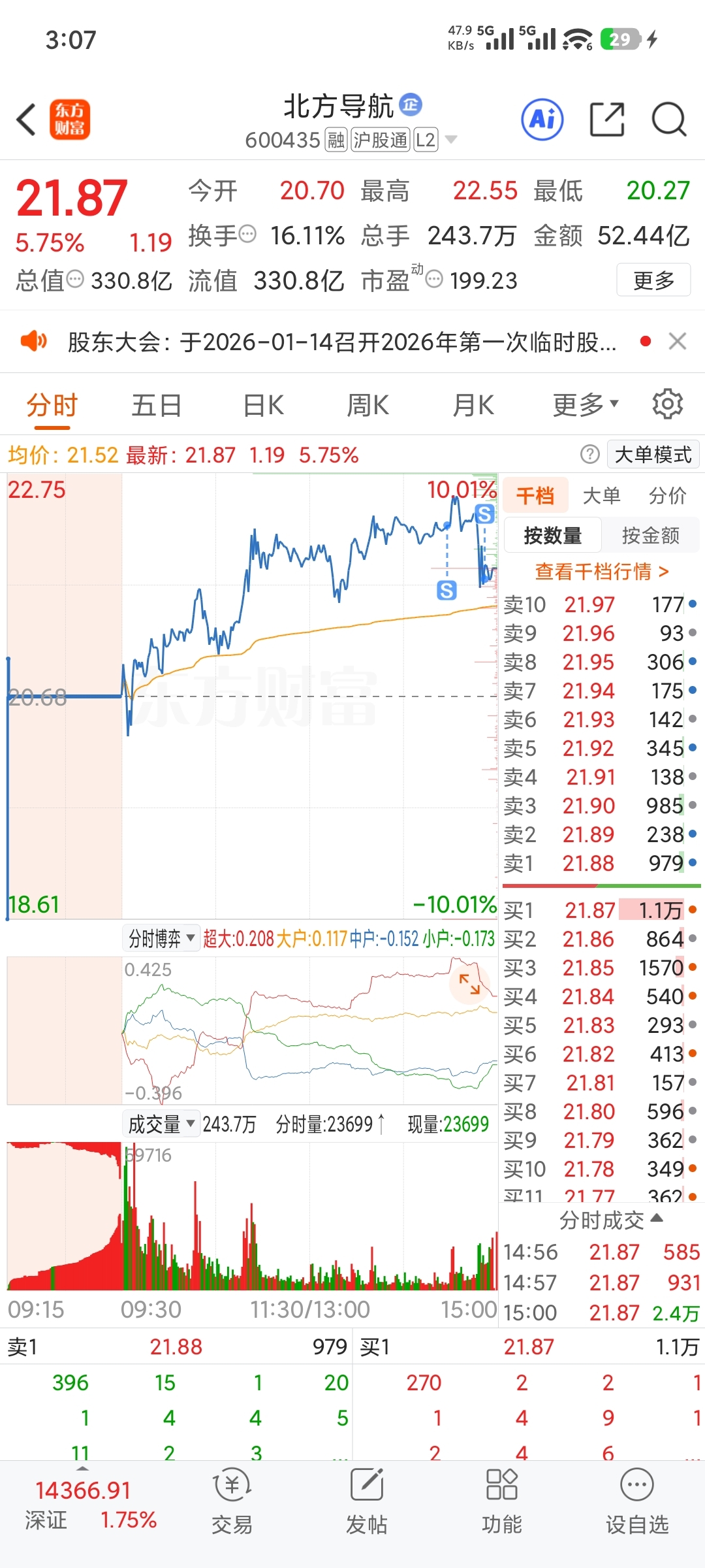 $北方导航(SH600435)$ 今天不是板块上天了还带不动这杂毛,拜拜
