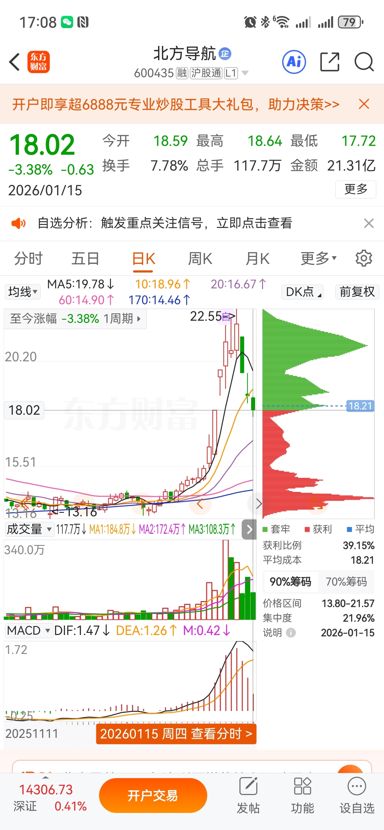 $北方导航(SH600435)$ 跌的这几天底部获利的筹码分布一动不动,这是意味着主力还在吗?那是不是在酝酿一个二波行情,如果是明天全仓干