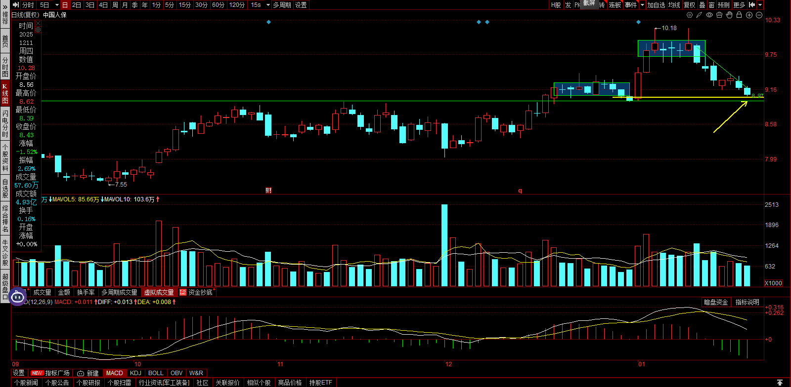 牛股起涨点:中国人保最后还有一阴,等待阳包阴。